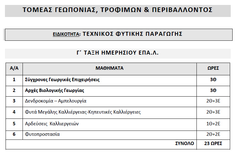 Τεχνικός Φυτικής Παραγωγής (ωρολόγιο πρόγραμμα)