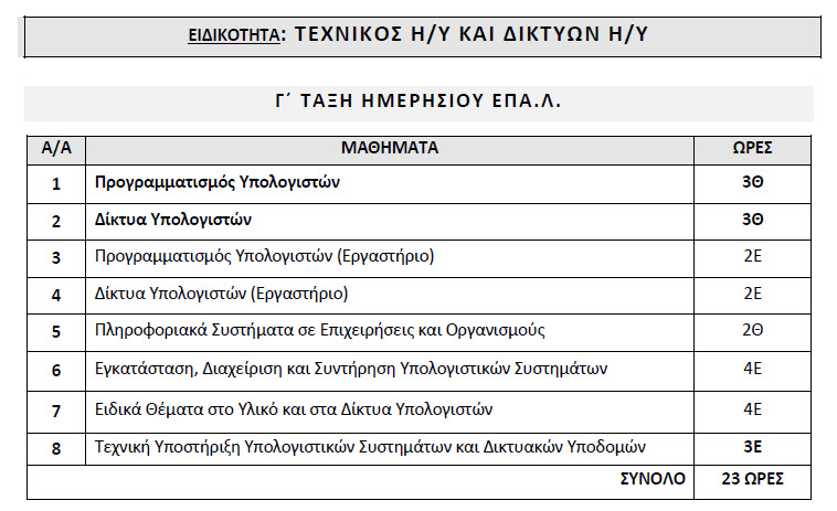 1. Τεχνικός Η/Υ και Δικτύων Η/Υ (ωρολόγιο πρόγραμμα)